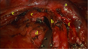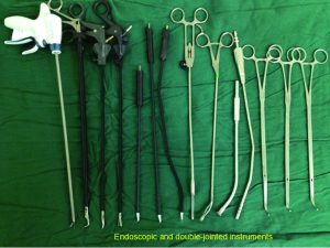 The operator and the scope holder always stand anterior to the patient whether the operator stands caudally or cranially varies depending on the procedures in the lower or upper thoracic cavity. The first assistant stands posteriorly responsible for the macro exposure. The surgeon always holds suction tube in the left hand for micro and dynamic exposure while in the right hand almost are the electrocautery or harmonic scalpel. From posterior to anterior at the incision level lies in turn the scope, the long curved ring forceps containing gauze for macro exposure, the energy devices and the suction tube (Figure 6).