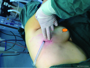 The lung is re-expanded for air leakage testing for the bronchial stump and the pulmonary resection margin. Finally a single 24# chest tube with enough side holes is placed in the posterior part of the incision up to the tip of the thoracic cavity (Figure 10).