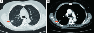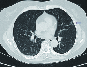 A 64-year-old female presented with a 2.0 cm × 2.0 cm × 1.0 cm nodule in posterior segment of right upper lobe and a ground glass opacity (GGO) in the left upper lobe on computed tomographic (CT) (Figures 1,2) was admitted in our institute on March 16th, 2014. The patient underwent preoperative staging and cardiac and pulmonary function assessment. PET-scan indicates no signs of metastasis. Under general anesthesia with double lumen tube, the patient underwent uniportal cVATS lobectomy for right upper lung tumor on March 19th, 2014 (Figure 3). The final pathologic TNM staging is T1aN0M0 (IA). Regular follow up was initiated for the GGO in the left upper lobe.