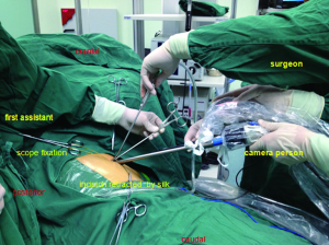 With experiences from biportal approach and uniportal approach for minor procedures, we learned that adequate exposure of the lung is mandatory in order to successfully access the interested lobe. The first assistant stands posteriorly responsible for the macro exposure. The surgeon always holds suction tube in the left hand for micro and dynamic exposure while in the right hand almost are the electrocautery or harmonic scalpel. The camera person leaves the scope displaying a close-up view of the target tissue. For all the team members and his devices, each does his part and work together and then contribute to good exposure.