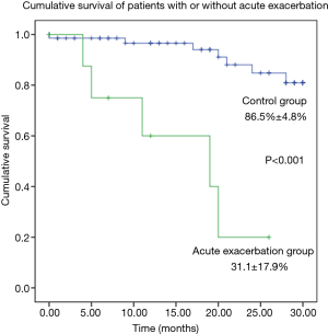 Overall, 12 patients died during the follow-up, and AE was the main cause of death in 5 patients; 3 other subjects died for infections, 2 for the evolution of the lung disease, the last 2 for the complications of a lung transplantation and for aspiration pneumonia. Survival of patients with and without AE was summarized in Figure 1. The baseline value of DLCO was the only predictive factor of death with a reduction of the risk of 0.946 for every 1%-increase of DLCO (HR: 0.951; 95% CI, 0.911–0.992; P=0.02).