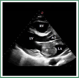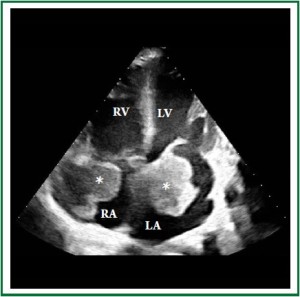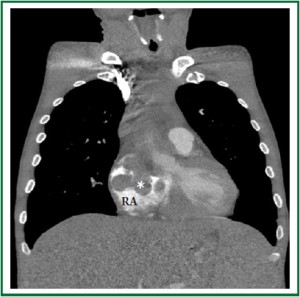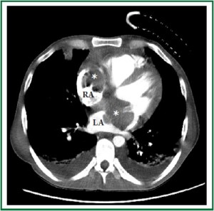 A 46-year-old Caucasian male was admitted to the emergency room with progressive dyspnea, lower limb edema and intermittent fever for 1 month. Past medical history included HIV infection for 20 years, with irregular highly active antiretroviral therapy (HAART) treatment. He had a history of smoking, alcoholism and cocaine addiction. On physical examination, the patient presented with a rapid respiratory rate, blood pressure of 118×68 mmHg and heart rate of 104 bpm. Laboratory data revealed hemoglobin concentration of 6.7 g/dl, white blood cell count of 3.600 /mm 3 and platelet count of 22.000 /mm 3, with a CD4 count of 49 cels /μl. Computed tomography demonstrated a large, infiltrative, solid mass involving the ascending aorta, pulmonary artery, right ventricle and both atria ( Figure 1 and Figure 2) with a lymph node conglomerate in the anterior mediastinum. Transthoracic echocardiography revealed biatrial dilation, mild left ventricular hypokinesia and severe right ventricular impairment. A large echodense mass with irregular borders filled almost completely the left atrium ( Figure 3), while another mass was observed inside the right atrium ( Figure 4), both attached to the interatrial septum. Increased transvalvular mitral and tricuspid gradients were observed by Doppler study. HAART was started along with intratechal methotrexate, followed by intravenous dexamethasone. Mediastinal biopsy revealed a HHV8-positive PBL. Tumoral cells showed positivity for immunohistochemical markers HHV8, MUM-1, CD138 (focal), CD20 (focal) and Ki67 (high index), whereas CD3 and Epstein-Barr virus (EBV) resulted negative. Bone marrow biopsy showed rare neoplastic cells, compatible with interstitial infiltration by HHV8-positive PBL. Chemotherapy with cyclophosphamide was started. A control echocardiogram after 3 days showed no tumor regression, but significant deterioration of systolic
