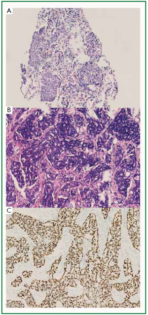 from breast biopsy were immune-positive for thyroid transcription factor-1. The two patients survived 5 and 8 months,