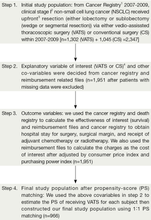 Our study flow chart is depicted in Figure 1. Our target populations were clinical stage I NSCLC patients received either VATS or CS within 2007-2009. In brief, the date of admission for surgery was used as the index date. We set the duration of interest as one year within the index date. We then decided the explanatory variable of interest (VATS vs. CS) based on the reimbursement coding. We also collected other covariables for the adjustment of potential non-randomized treatment selection and cost and effectiveness data from the CCHIA (see next sub-section “other explanatory covariables”). Finally, we constructed a PS matched sample based on PS estimated through the above covariables to compare the cost and effectiveness of VATS vs. CS within the duration of interest. In PS analysis, we modeled the use of VATS (vs. CS) as the dependent variable and the covariables as independent variables, and used non-conditional logistic regression to model the probability of receiving VATS as commonly used in the literatures (11,12). We then used the logit of the probability as the PS, as commonly used in the literature (12). This study had been approved by Research Ethics Committee in our institute [CMUH103-REC-005].