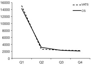 Our results were compatible with the literatures in that VATS provides better survival (1,3). The higher cost for VATS might partly be due to the higher operation fee for VATS vs. CS (dereferences in operation fee: $399 for VATS lobectomy vs. CS lobectomy whereas $224 for VATS sublobectomy vs. CS sublobectomy, both in USD 2013). Our estimated cost within 1 year after surgery was also higher for VATS as ever reported by other study (8), although conflict results had also been reported (7,15,29-31). Our updated estimates were also in line with our previous preliminary estimates but were more representative now given the much larger sample size (10).