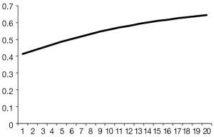 The mean hospital stay (in days, with standard deviation (SD)) were 14.4 [7] and 16.1 (7.7) for VATS and CS respectively (P=0.002). The distribution regarding surgical margin and receipt of adjuvant chemotherapy or radiotherapy were similar between VATS and CS without statistical significance. For the entire follow-up period, the survival rate of VATS was better than CS (2 years: 92% vs. 90%, P=0.8), but was not of statistical significance. The Kaplan-Meier survival curve is depicted in Figure 2. The mean cost (2013 USD) and survival (year) within one year after surgery were higher for VATS versus CS ($22,316 vs. $21,976; 0.98 vs. 0.974). Given the above incremental cost $340 (=22,316 – 21,976) and incremental effectiveness 0.06 (=0.98 – 0.974) LY, the net benefit if WTP equals $50,000/LY would be negative $40 (=0.006*50,000 – 340) but positive $260 (=0.006*100,000 – 340) if WTP equals $100,000/LY. The incremental cost-effectiveness ratio (ICER) when VATS was compared to CS was 56,667 (=340/0.006) (USD/LY). The above results were also tabulated in Table 2. Although VATS is associated with higher initial cost (in the 1st quarter after surgery), the difference is not obvious in the end of follow-up (Figure 3). When we changed the WTP level, the corresponding probability of VATS to be cost-effective (i.e., positive net benefit) as estimated by paired t-test was shown in Figure 4. For example, the probability was 0.49 & 0.56 at WTP 50,000 & 100,000, respectively.