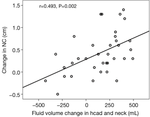 Relationships between PSG parameters and change in body composition parameters are shown in Table 5. AHI correlated significantly with an increase in NC (r=0.696, P<0.01), increase in fluid volume in the trunk (r=0.348, P<0.05), and decrease in fluid volume in both legs (r=0.525, P<0.01; r=0.780, P<0.01). However, there was no significant correlation between AHI and change in fluid volume in the head and neck (r=0.333, P>0.05). The significant correlation between the change in NC and the increase fluid shift volume in head and neck was found (r=0.493, P<0.01; Figure 1): the more fluid shift volume in the head and neck, and the greater the increase in NC.