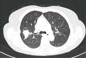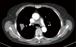 A patient, female, 61 years old, was discovered with a space-occupying lesion on the right upper lung (Figures 1,2) during the routine physical examination. She has no past medical history (PMH) of long-term chronic diseases. After knowing that this mass might be lung cancer, the patient refused aspiration biopsy and asked for a thoracoscopic exploratory surgery.