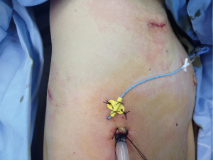 We apply general anesthesia and double-lumen trachea cannula routinely. In order to achieve a better analgesic Port placement effect for facilitating cough and expectoration during the perioperative period and to leave an observation hole after the surgery (leaving a postoperative drainage tube) and continuous intercostal nerve block (Figure 3).
