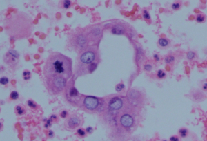 One month after icotinib treatment, while still on icotinib therapy, the patient was admitted to our hospital with continuous dry cough and rapid progressive dyspnea, denying lying down. Chest pain and haemoptysis was denied. Physical examination revealed decreased breath sounds in left lower lobe, some inspiratory crackles in right lower lobe and distant heart sounds. Oxygen saturation was 85% in room air and supplemental oxygen was given via nasal cannula. Leukocyte count was elevated with 15.92×109 cells/L. Blood cultures and sputum analysis initially was tested negative. Precursor of B-type natriuretic peptide was normal. Arterial blood gas analysis indicated presence of hypoxemic respiratory failure. Hence, pericardial effusion, left pleural effusion and lower respiratory tract infection was suspected. Ultrasound revealed massive pericardial effusion and left pleural effusion. Percutaneous pericardial drainage and chest catheter closed drainage was conducted. Pathological examination of pericardial fluid sediment revealed metastatic adenocarcinoma from lung (Figure 1). Intracavitary chemotherapy with etoposide (0.3 g) and cisplatin (100 mg) was administrated in the treatment of pericardial effusions. Antimicrobial therapy was pragmatically initiated with intravenous levofloxacin (500 mg once daily). Other medications included furosemide 20 mg, asmeton 2 tablets and selenious yeast tablets 100 µg (3 times daily).