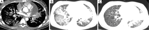 Forty days after icotinib treatment, ILD was suspected when the patient still became increasingly dyspnoeic, despite of treatment of pericardial effusion, left pleural effusion and lower respiratory tract infection. The onset of continuous cough and dyspnea and characteristic newly emerged diffuse ground-glass opacities in bilateral lobe both supported the diagnosis of ILD (Figure 2B,C). The case scored 5 by using the Naranjo scale (12). Hence, it is probable that ILD was associated to icotinib. Icotinib was discontinued and intravenous corticosteroid was started (methylprednisolone 40 mg once daily, about 1 mg per kilogram) respectively. The condition of patient went worse even under the above medication. Forty-three days later, the patient died of hypoxic respiratory failure. Autopsy was not performed due to lack of permission from her parents.