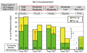 Comparing studies suggests that PET is beneficial in preoperatively identifying N2,3 involvement when the risk is high and there is a high rate of invasive staging. PET seems to help identify N2,3 disease even when almost all patients undergo mediastinoscopy-perhaps by directing attention to suspicious nodes. When PET is used to decrease the rate of invasive staging, it appears that the risk of intraoperative discovery of N2 involvement is increased, at least in a patient cohort with a moderate incidence of mediastinal nodal disease. When the risk of N2.3 disease is low, PET has little impact on preoperative identification of nodal involvement.