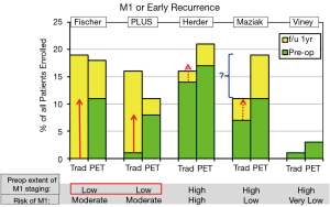 Does PET identify more patients with distant metastases preoperatively and reduce the number found to have M1 disease or recurrence within 1 year? This was seen in the Fisher and PLUS studies but not clearly so in the others (Table S3, Figure 2) (1-5).