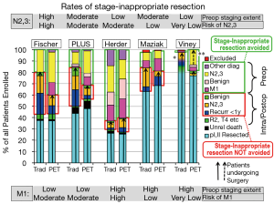 We defined stage-inappropriate resection as surgery for patients with benign lesions or with N2,3 or M1 involvement (although we acknowledge that exceptions exist and sometimes surgery may be considered appropriate). The Viney et al.’s study (3) results are presented as if N2 involvement was a contraindication for surgery (contrary to the study authors’ policy) in order to be consistent with the general view and with the other studies. Avoidance of inappropriate surgery is important, but so is inappropriately missed resection due to falsely interpreted preoperative staging. Because this was not explicitly reported, we estimated the risk of missed stage-appropriate resection from the incidence of positive PET results subsequently shown to be false-positives.