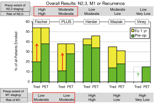 Potential factors influencing the impact of PET include scanner technology, interpretation quality, and the extent of confirmation of abnormal findings. These factors also varied between studies (Table 2). The thoroughness of the PET interpretation is patterned according to a proposed scale (11). In most studies only a few institutions performed PET scans for all participating sites. This concentrated experience may affect the quality of the interpretation. Only in the Maziak study was PET performed in a more disseminated fashion. The thoroughness of the PET and of preoperative testing for N2,3/M1 disease is qualitatively summarized in the last three columns of Table 2.