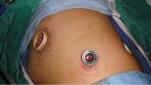- VATS access can be by single, double, triple or four ports in contemporary practice. Single-port surgery promises minimal trauma and best cosmesis, but may result in more difficult operating conditions. By increasing the number of operating ports, the surgery is easier, surgical speed is improved and we can save more time. Different port access approaches each have their advantages and disadvantages, and should be based on the surgeon’s skill and operating practices, as well as the equipment used. We routinely use triple-port surgery, in this way we can place the suction and electrical hook through the utility port in the 5th intercostal space to divide the anterior mediastinal pleura, and through the posterior working port in the 8th intercostal space to divide the posterior mediastinal pleura. During division of the vein and bronchus, when using the stapler from the posterior working port, it is possible to get a better operating perspective, especially using non-roticulating stapler instruments;