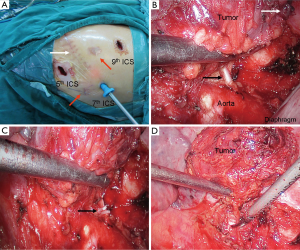 The patient was placed in the right lateral decubitus position after general anesthesia with double-lumen endotracheal intubation. Both arterial blood pressure and central venous pressure were monitored carefully during the operation. A 1-cm thoracoscopic port was made in the seventh intercostal space (ICS) on the midaxillary line. After thoracoscopic exploration, the other two 2-cm incisions were made in the fifth ICS on the anterior axillary line and in the ninth ICS between the posterior axillary line and the scapular line, respectively (Figure 3A). Pleural adhesiolysis was performed first. A 2 cm × 3 cm mass was found in the left side, adjoining the T11-T12 vertebral body. The patient’s blood pressure varied between 125/75 and 165/95 mmHg when cutting the pleura along the basement of the mass. After ligating the vein of the tumor, his blood pressure decreased to 90/50 mmHg, and intravenous norepinephrine was administered to maintain hemodynamic stability. En bloc resection of the tumor was achieved after transecting the nutrient artery derived from the descending aorta (Figure 3B-D). The tumor was removed using a bag made from a rubber glove.