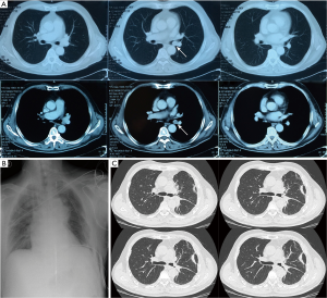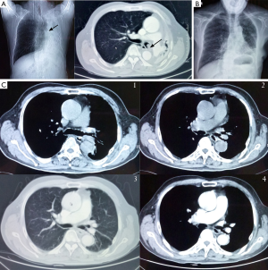 A 67-year-old man was admitted to our hospital in July 2012 complaining of hemosputum and chest pain. The patient accepted intravenous chemotherapy 4 times with paclitaxel and cisplatin before treatment in our clinic, and without any improvement in symptoms. Chest CT scan showed an intraluminal mass at the left main bronchus, the whole left lung was atelectasis (Figure 2A). Endobronchoscopy examination showed a papillary neoplasm bulge at the middle left main bronchial cavity in about 1 cm diameter, completely blocking the lumen. Biopsy revealed low-grade malignancy, tendency to adenoid cystic carcinoma. The basic surgical procedures in this patient were same as the first case, and the two-step anastomosis was performed between the left main bronchus and the ends of the left upper and lower bronchi, using 3-0 Vicryl sutured. The anastomosis was wrapped with the intercostal muscle pedicle flap at last. The unique procedure was that we had repeated lung lavage several times before anastomosis was performed, in order to identify the lung parenchymal was not infringed by lung abscesses and could be recruited during ventilation. The postoperative follow-up was over 2 years without recurrence of the tumor (Figure 2B,C).