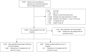 Adults (≥18 years) who had a lobectomy for neoplasm from January 1, 2008, through September 30, 2015, were included. The International Classification of Diseases, Ninth Revision, Clinical Modification (ICD-9-CM) was used to define cases and approaches (Table S1). Minimally invasive lobectomies converted to OL were classified by the initially intended approach (VL or RL). Exclusion criteria included patients aged <18 years, prior thoracotomy, emergent or urgent cases, operating room (OR) duration ≤1 or ≥24 hours, LOS ≤0 days, and total in-hospital cost ≤$0. Cases with missing data were excluded.