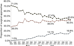 From 2008–2015 Q3, there were 39,061 lobectomies for lung neoplasm, and 6,406 patients were excluded. Of the remaining 32,655 lobectomies, there were 17,182 (52.6%) OL, 12, 543 (38.4%) VL, and 2,930 (9.0%) RL (Figure 1). The trend of surgical approaches is shown in Figure 2. There was a decline in OL (71.0% in Q1 2008 to 42.6% in Q3 2015, P<0.0001) and increase in RL (1.0% in Q1 2008 to 16.9% in Q3 2015, P<0.0001) and VL (28.0% in Q1 2008 to 40.5% in Q3 2015, P<0.0001).