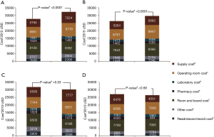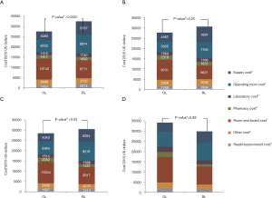 Analysis of costs between VL and RL cases for all hospitals and hospitals with >25 annual lobectomies are shown in Table 2. Costs of RL were higher than VL in both periods when hospital volume is not considered. Median 30-day perioperative direct cost of RL was $1,328 higher than VL in the early period (P<0.0001) and $1,279 higher vs. VL in the late period (P<0.0001). However, for hospitals with >25 annual cases, there was no difference in total costs for both the early and late periods (P=0.24 early period, P=0.18 late period). The median direct in-hospitalization cost of RL in higher-volume hospitals was lower than VL in the early period by $1,191 (P=0.03) and similar to VL in the late period (P=0.13). Figure 3 shows the breakdown of costs between RL and VL for both periods in all hospitals and those with >25 annual cases. When costs in all hospitals were analyzed, the higher total costs of RL were attributable to OR costs and supply costs. In hospitals with >25 annual RL or VL cases, RL was cost-neutral with VL due to the decreased room and board, supply and OR costs (early period P=0.53, late period P=0.59). Breakdown of room and board costs are shown in Figure S1.