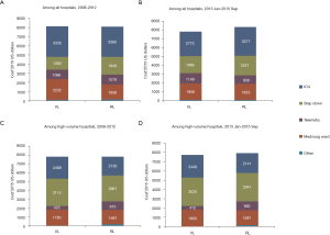 The effect of hospital volume on outcomes is complex, and in many hospitals it is inseparable from the contribution of surgeon volume. In higher-volume hospitals, the surgeons’ volume in those hospitals was also higher, indicating that the two factors are intertwined. Published data indicate that hospitals with higher volume have better outcomes than their lower-volume counterparts (21,22). This is particularly true for minimally invasive lobectomy, as previous studies demonstrated that clinical outcomes of RL and VL improved with increases in hospital volume (23,24). In this study, we chose to focus on the hospital volume since operative outcomes are dependent on a team of personnel involved in the OR and in the postoperative setting, not just on the surgeon.