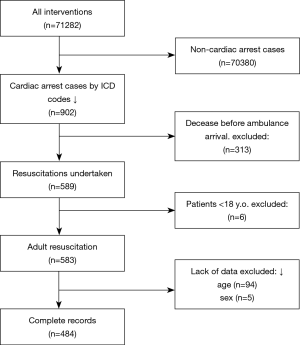 The study included 71,282 medical charts of Poznan EMS. After considering the inclusion and exclusion criteria, only 484 OHCA subjects were qualified for the final analysis. The mean age was 67.6±14.8 years (ranged from 18 to 96). The majority of them were male. SCA was detected more often in the city area. The selected data of individuals are outlined in Table 1.