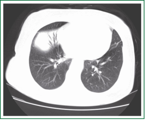 A 61-year-old female nonsmoker presented with a chief complaint of fever and cough. Chest computed tomography (CT) scan showed partial consolidation of the right middle lobe and patchy shadow in the right lower lobe. Fever and cough were not completely relieved after two weeks of anti-inflammatory treatment. A second CT revealed a lump (6 cm × 5 cm ×3 cm) in the right middle lobe (Figure 1). A subsequent right middle lobectomy was performed. In the resected lobe, we found a lump with the dimension of 5 cm × 4 cm × 3 cm. Cut section of the lump was grey and scattered with necrosis. Pleura was locally involved.