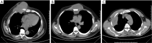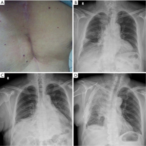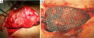 Advancements in surgical reconstruction techniques, including the employment of pedicled musculocutaneous flaps and/or various prosthetic materials make it possible to perform radical resections with eliminating the lesions, and good long-term survival (2-4). Despite the unremitting efforts, there was no consensus on the determination which approach to choose, mainly depending on the surgeon’s preference. The use of titanium-based devices, such as titanium clips, bars, plates and screws for chest wall reconstruction or ribs fractures fixation have been largely demonstrated, which could provide well-established chest stability and flexibility (3,5). Clinically, titanium mesh was widely used in the repair of skull defects (6). Currently, only a few case reports with respect on its applications in chest wall reconstruction were presented (7,8). We have reported a satisfactory application of titanium mesh in an aged woman with complex and major chest wall defects after removal of a lower-sternal mass in 2009 (9). Herein, the experience with titanium mesh to restore skeletal defects following radical chest wall tumor resections in our single institution was reviewed. Patients’ and tumors’ characteristics, the extent of the resection, resulting defects and postoperative complications as well as long-term follow-up were discussed.