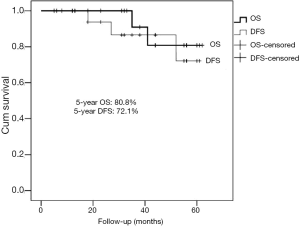 Table 4 summarized the postoperative follow-up course of all patients. The mean follow-up was 30.7 months (median 30.0 months, range, 4-62 months). All patients were seen every 3 months in the first year and then every 6 months, showing satisfactory cosmetic and functional outcomes (Figure 3A). During the course, none of the patients had experienced paradoxical respiratory motion or wound infection or skin necrosis. Furthermore, there was no mesh dislocation (Figure 3B-D). All patients performed VAS for pain measurement showed ‘excellent’ or ‘good’ outcomes points (median 3, average, 2.7). At the last follow-up, 23 patients were alive (19 with initially primary lesions and 4 with initially secondary lesions). Of those, two cases with local recurrence (one with fibrosarcoma and one with desmoid tumor) were observed at 52 and 27 months, respectively. Four died (two with initially primary disease including one with osteosarcoma, and one with sternal plasma cell tumors; two with secondary disease including one with Hodgkin lymphoma and one with squamous cell lung carcinoma). One died of both local recurrence and distant metastasis. Three cases of death were unknown. The 5-year DFS and OS of primary chest tumors was 72.1% and 80.8%, respectively (Figure 4).