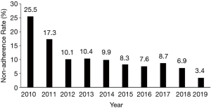 The primary outcome parameter in this study was the annual non-adherence rate over the 10-year study period. Secondary outcomes were patients’ characteristics and reported reasons for long-term HMV failure.