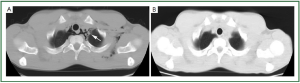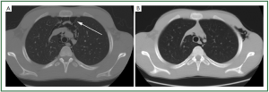 Figure 1. Massive emphysema of the superior mediastinum, around the trachea and vessels (A). Complete disappearence of