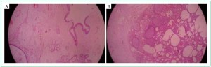 Both lesion on histopathological examination (Figure 3A, 3B) was found to be a mature cystic teratoma. Patient had an uneventful post operative period recovery. On 6 month follow up she is asymptomatic.