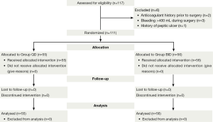 A total of 117 patients were enrolled in this study, and 111 eligible patients were randomly assigned to two arms: 55 patients in group QD and the remaining 56 patients in group BID (Figure 1). The demographics were comparable between the two arms (Table 1).