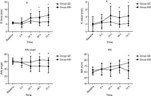Prior to and instantly after the operation, all TEG measures, including the R time, K time, α-angle and MA values, were within the normal range and comparable between the two groups (Figure 2). Then TEG values were analyzed on each of the 3 postoperatively consecutive days in both groups. The R time of both groups prolonged after receiving anticoagulants, but the change was more remarkable in group BID during the first 3 postoperative days (P<0.05). In additional, group BID had longer K time and smaller α-angle (P<0.05). Compared with group QD, MA of group BID decreased significantly on the third postoperative day (P<0.01), but not on the first and the second postoperative days (Figure 2).