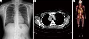 Chest X-ray and chest computed tomography (CT) confirmed a mass (6 cm × 4 cm × 4 cm) at the right superior and mid-mediastinum (Figure 1A,B). Positron emission tomography (PET) showed accumulation of fluorine-18-2-fluoro-2-deoxy-D-glucose in the tumor at a maximum standard uptake value of 9.21, whereas no other abnormal uptake suggestive of a metastatic lesion was found (Figure 1C). On the basis of the imaging findings, preoperative differential diagnoses included lymphoma, CD, thymoma, and neurogenic tumor. Diagnostic thoracoscopic surgery was planned based on the suspicion of lymphoma. A double-lumen endotracheal tube was placed, and the patient was positioned in the left lateral decubitus position. With single-lung ventilation, an initial 10-mm port was placed in the seventh intercostal space at the midaxillary line. This was followed by placement of two additional 10-mm ports in the fifth intercostal space at the anterior axillary line and the sixth intercostal space at the posterior axillary line.