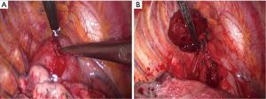 Thoracoscopic exploration revealed no other gross abnormalities, except for the mass located at superior mediastinum, which was located between the azygous and superior vena cava. After incising the parietal pleura, a large, highly vascular, soft tissue mass was observed (Figure 2A). Small pieces of tumor tissue were submitted for intraoperative pathological examination by frozen section. The pathological examination showed no evidence of malignancy and no diagnostic conclusion was made. One of the 10-mm ports at the anterior axillary line was converted to a 3-cm working port to remove the mass. During mobilization by dissection, we observed that the tumor was fragile and tended to bleed easily and there was loose adhesion between the mass and surrounding organs with a single feeding vessel at the center of the mass. However, meticulous bleeding control to avoid break down the mass by use of electrocautery and clips allowed this mass to be removed completely without damage to surrounding structures (Figure 2B, Figure 3). Macroscopic examination showed a 5.8 cm × 4.5 cm × 2.5-cm tumor weighing 36 g. Blood loss during surgery did not exceed 300 mL. A single chest tube was placed with achievement of hemostasis. The patient had the chest tube removed on the 4th postoperative day and was discharged home the next day. A pathological diagnosis was consistent with plasma cell type CD (Figure 4A,B). Three months after surgery, without any medical intervention, the laboratory data had recovered to the normal range (hemoglobin, 14.5 g/dL). She receives regular follow-ups and no recurrence has been found for 5 years since surgery.