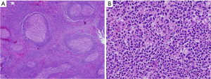 The main histological subtypes of CD are the hyaline vascular type and the plasma cell type. The hyaline vascular type includes 80% to 90% of cases, and the plasma cell type includes the remaining 10% to 20% of cases (1,8). Clinically, CD is separated into unicentric or multicentric forms. In unicentric CD, the hyaline vascular type comprises up to 90% of cases and the plasma cell type comprises approximately 10-20% of cases. While the hyaline vascular type is rarely found in multicentric CD, 80-90% of multicentric CD cases are plasma cell type (9-11). Systemic manifestations, such as anemia, fever, excessive sweating, weight loss, night sweating, fatigue, and growth retardation are more common in multicentric CD, and are rarely reported in unicentric CD (1,3,8,12).