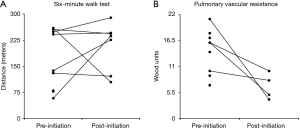 Results from routine prognostic studies obtained prior to initiation of parenteral therapy and at first clinical follow-up were recorded. These studies included N-terminal prohormone of brain natriuretic peptide (NT-proBNP) level, 6-minute walk test (6MWT), WHO Functional Class assessment, oxygen requirement, arterial oxygen saturation, echocardiography measuring right ventricular systolic pressure (RVSP), and RHC measuring right atrial pressure (RAP), mPAP, CI, and pulmonary capillary wedge pressure (PCWP). Oxygen requirement and arterial oxygen saturation data were acquired at the beginning and during 6MWT, at rest and with exertion.