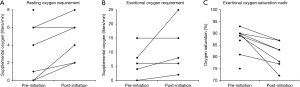 At first follow-up, there was no significant change in functional class, RVSP by echocardiogram, NT-proBNP level or 6-minute walk distance (6MWD). Due to patient mortality, repeat RHC was only available in four patients and thus statistical testing was not performed; however, a decrease in pulmonary vascular resistance (PVR) and an increase in CI was seen in all four patients (Figure 1 and Table 2). All but one patient was oxygen-dependent at the time of prostanoid initiation, and this tended to worsen during follow-up (Table 3). Specifically, resting oxygen requirement increased from a median of 4 to 6 L/min (P=0.04), exertional oxygen requirement increased from a median of 6 to 8 L/min (P=0.06) and oxygen saturation nadir during exertion declined from a median of 90% to 83% (P=0.01), despite the increase in FiO2 with exertion (Figure 2).