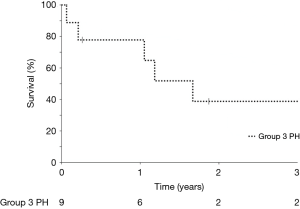 This study was a retrospective cohort study that included all patients with severe Group 3 PH, defined as mean pulmonary arterial pressure (mPAP) ≥35 mmHg or mPAP 25–34 with cardiac index (CI) <2.4 L/min/m2 on right heart catheterization (RHC). Patients were included if they had a qualifying lung disease, such as idiopathic pulmonary fibrosis (IPF) or combined pulmonary fibrosis and emphysema (CPFE), along with severe abnormalities on spirometry [forced vital capacity (FVC) or forced expiratory volume in 1 second (FEV1) <50% predicted], or diffuse lung disease on imaging plus a diffusion limitation of carbon monoxide (DLCO) <50% predicted. In addition, patients were required to have initiated intravenous epoprostenol or intravenous or subcutaneous treprostinil between 2007 and 2018 at the University of Texas Southwestern Medical Center. Both treatment naïve and patients previously started on other PH-specific therapies were included, which may be a potential confounder. Patients starting parenteral therapy within 2 weeks or less of starting an oral therapy were considered treatment naïve. The PH evaluation included an echocardiogram, RHC, pulmonary function tests (PFTs) and ventilation-perfusion scan, as well as additional tests when indicated. Institutional review board approval was obtained from the University of Texas Southwestern Medical Center Human Research Protection Program (#052015-041), including a waiver of informed consent. The study was conducted in accordance with the Declaration of Helsinki (as revised in 2013).