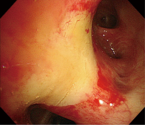 A 70-year-old man underwent lingular segmentectomy via thoracoscopic surgery (TS) for pulmonary aspergilloma. The bronchial artery (BA) was damaged while dissecting the interlobar lymph nodes during surgery. The electrode tip of the electrocautery device was kept in contact with the anterior bronchial wall at the second carina during hemostasis of the BA, using soft coagulation mode (Figure 1). The operation was accomplished without any other problems. Bronchoscopy on postoperative day 5 revealed ischemia in the anterior bronchial wall at the level of the second carina (Figure 2). Bronchial ischemia resolved on postoperative day 30, without BPF.