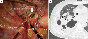 Right lower lobectomy via TS was performed for stage IA lung adenocarcinoma in a 66-year-old woman. Bleeding from the BA occurred during surgery when exposing the bronchus, adjacent to the lateral bronchial wall of the lateral segmental bronchus (B4), which was stanched using the soft coagulation mode (Figure 3A). Lobectomy was accomplished without any other complications. Thirteen days after the operation, the patient visited our emergency room for acute dyspnea. Chest computed tomography and bronchoscopy revealed a BPF of the middle lobar bronchus, at exactly the same site where the intraoperative bleeding was stanched, suggesting bronchial injury caused by electrocautery (Figure 3B). Thoracoplasty concomitant with plombage of the latissimus dorsi muscle was performed 1 month after open window thoracotomy. The patient was discharged from the hospital 50 days after the second admission.