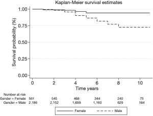 Female gender is an independent risk factor for increased mortality after surgical revascularization. Worse outcome of invasive treatment in CAD in women was proved in several studies (7-16) and therefore female gender was included in predictive preoperative scores, including EuroScore calculator and STS score. Perioperative mortality in our study described by EuroScore II were insignificant between both groups with mean values of 1.16±0.2 and 1.21±0.3 (P=0.0327). Results presented in our study confirm the male sex as significant factor for lower all-cause late mortality.