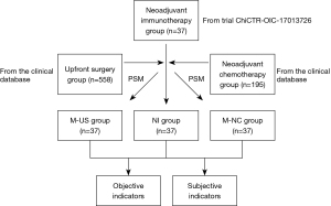 We retrospectively matched two cohorts to the ICI neoadjuvant cohort (NI group) from the clinical database of the Department of Thoracic Surgery using the propensity score matching (PSM) method to minimize selection bias. The characteristics selected for the match were clinical stage, sex, age at surgery, histological type, smoking history, and family history of cancer. All selected patients had an ECOG score of 0. One cohort underwent upfront surgery without preoperative treatment (M-US group), and the other received platinum-based neoadjuvant chemotherapy (M-NC group). The clinical staging of all patients was determined by preoperative imaging examination with enhanced chest computed tomography (CT) or positron emission tomography (PET) CT, or pathology results from a biopsy of the primary tumor and suspected lymph nodes. Notably, we included only patients who underwent surgery at our center during the same period of the PD-1 blocking trial.
