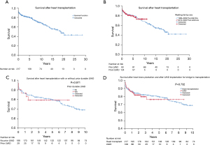 Overall post heart transplant survival rates were 86.6% and 68.8% at 1- and 10-year respectively with median survival of 18.5 years (Figure 4A). The post heart transplant survival remained static in different eras (Figure 4B). There was no significant difference in the post-transplant survival between recipients with and without prior durable LVAD (Figure 4C). Overall survival rates after LVAD implantation for BTT were 86.1%, 81.7% and 76.1% at 1-, 2- and 4-year respectively. There was no significant difference in survival after LVAD for BTT and after HTx (76.1% vs. 72% at 8 years respectively, P=0.732) (Figure 4D).
