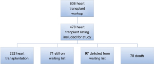 - Jasseron C, Legeai C, Jacquelinet C, et al. Prediction of Waitlist Mortality in Adult Heart Transplant Candidates: The Candidate Risk Score. Transplantation 2017;101:2175-82. [Crossref] [PubMed]