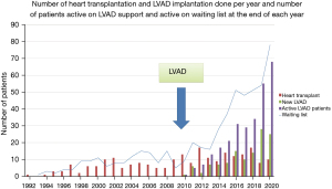 Despite the advancement in the heart failure treatment, the prognosis of patients with advanced stage D heart failure is extremely poor with the 5-year survival rate of 20 percent and the treatment options remain limited (1-3). Heart transplantation (HTx) has been the standard therapy for suitable patients with advanced heart failure but limited donor availability remains the Achilles’ heel for this therapy and mortality on transplant waiting list remains high (4-6). The number of heart transplants in Hong Kong (HK) remained low with only 10 heart transplants performed in a 7.5-million population in 2020. The use of pulsatile left ventricular assist device (LVAD) was first approved as bridge to transplantation (BTT) in mid-1990s and as destination therapy (DT) in 2003 (7,8). Subsequently, the improvement in LVAD pump design has led to significant improvement in clinical outcomes which resulted in more widespread use of LVAD for advanced heart failure (9-12) with the annual LVAD implantation number increased from less than 500 before 2007 to more than 2,600 in 2018 in the Interagency Registry for Mechanically Assisted Circulatory Support (INTERMACS) registry (13,14). However, the impact of the implementation of LVAD service in the setting of scarce heart transplant donor in an Asian city remained unclear. This study aimed to evaluate the impact of the implementation of LVAD therapy on the HTx service in HK.