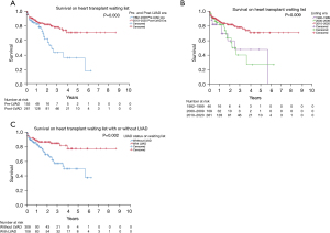 Continuous variables were expressed as mean ± standard deviation of the mean (mean ± SD). Categorical data were expressed as numbers and percentages. Missing values were tackled by multiple imputation with five imputations used for final pooled analysis. Continuous variables were compared by student’s t-test or ANOVA as appropriate. Chi Square test was used to determine the differences between categorical variables. Survival on HTx waiting list between pre-LVAD era 1992–2009 and post-LVAD era 2010–2020 were analyzed by Kaplan-Meier method and compared by log-rank test. The fulfillment of proportional hazards assumption was confirmed by testing simple product of the time variable and the covariate as well as the covariate in Cox-proportional hazard model with the result of P value of the product of the time variable and the covariate >0.05. Time-dependent Cox-proportional hazard model was used and factors with P value ≤0.1 on univariate analysis were accepted for subsequent multivariate analysis to identify independent predictors of waiting list mortality. Time from HTx listing to LVAD support was analyzed as a time-dependent variable because not all patients received LVAD support at the time of HTx listing but some received LVAD support later when their condition deteriorated on the HTx waiting list. All tests were two sided, and a P value <0.05 was considered statistically significant. Statistical analyses were performed in SPSS for Windows version 28 (SPSS Inc., Chicago, IL, USA).
