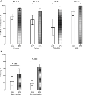 There were differences in stent detection ability depending on the location: trachea, RMB and RBI, and LMB. In the LMB, DTS had the best ability to detect stents, with a sensitivity of 98.7% (95% CI, 93.1–100.0%). The sensitivity of DTS in detecting stents located in the trachea was the lowest at 85.9% (95% CI, 75.0–93.4%) (Table 2, Figure 1A).